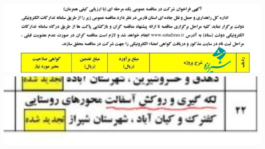 و همانطور که مشاهده میکنید در این مناقصه تنها «لکهگیری و روکش جاده کفترک» در دست اقدام قرار میگیرد؛ در حالیکه این موضوع، موضوع اصلی مورد مطالبه مردم نیست.