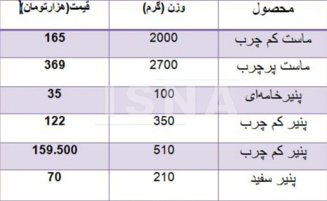 این شرایط، کاهش تقاضا و افت مصرف را به دنبال داشت و بر اساس مشاهدات میدانی خبرنگار ایسنا، ماست دبهای کمچرب ۲ کیلویی ۱۶۵ هزار تومان، ماست پرچرب دبهای ۲ کیلو و ۷۰۰ گرمی ۳۶۹ هزار تومان، پنیرخامهای ۱۰۰ گرمی ۳۵ هزار تومان، پنیر ۳۵۰ گرمی ۱۲۲ هزار تومان، پنیر ۵۱۰ گرمی کم چرب ۱۵۹ هزار و ۵۰۰ تومان، پنیر سفید ۲۱۰ گرمی ۷۰ هزار تومان به فروش میرسد که نسبت به ماههای گذشته و یا حتی هفتههای گذشته افزایش قیمت قابل توجهی داشته است.